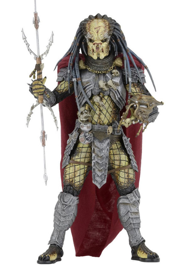 Elder Predator wears a regal soft goods cape with real chain and comes with a removable mask and staff accessory.