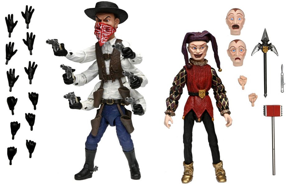 "...and now a box of little toys has become a gang of little terrors." NECA is proud to present the Ultimate Six-Shooter & Jester 2 Pack from the cult movie series, Puppet Master! Each figure stands approximately 4.25" tall, representing the classic look of each puppet, with accessories themed to the character's appearances in the franchise. Six-Shooter includes removable hat and bandana, interchangeable hands, and 6 revolvers. Jester includes removable fool's hat, scepter, tenderizer, scalpel, interchangeable expressions and hands. Comes in window box packaging replicating Andre Toulon's Puppet Case.