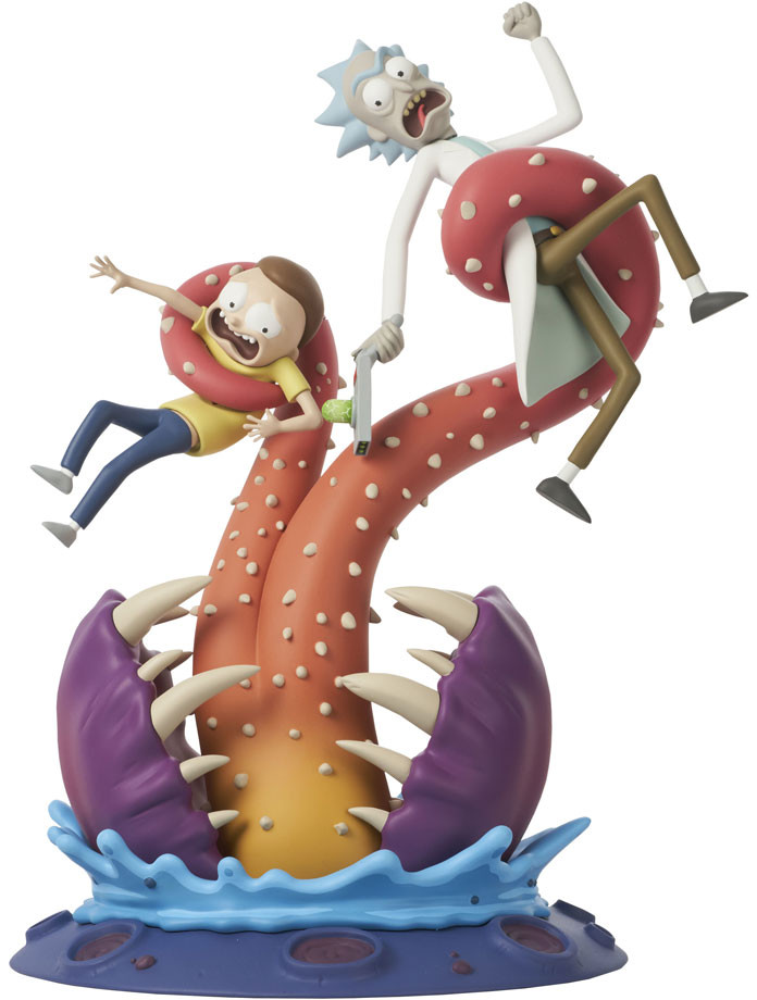 Look out, Morty! In this, the first Rick & Morty collectible from Diamond Select Toys, Rick and his grandson Morty are caught in the spiked tongue of a mysterious creature, even as Rick levels his portal gun at the monster. Measuring approximately 10" tall, this Gallery Diorama is made of high-quality PVC, and comes packaged in a full-color window box. Designed by Joe Allard, sculpted by Casen Barnard!
