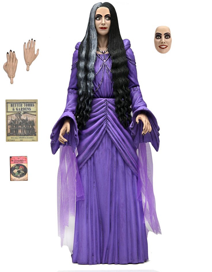 From Rob Zombie's The Munsters, NECA introduces Lily Gruesella-Munster as an Ultimate action figure! After a failed date with a familiar face, Lily discovers comedian sensation Herman Munster, and it's love at first fright. Much to her father's dismay, the two marry and, after a hairbrained scheme by a hairbrained brother, set their sights on Hollywood. This 7" scale action figure fits perfectly with the rest of the NECA Munsters Ultimate line, and includes a soft goods accents, interchangeable face plate expressions, alternate hands, book, and magazine. Comes in display friendly 5-panel packaging with opening front flap featuring custom artwork by Daniel Horne.