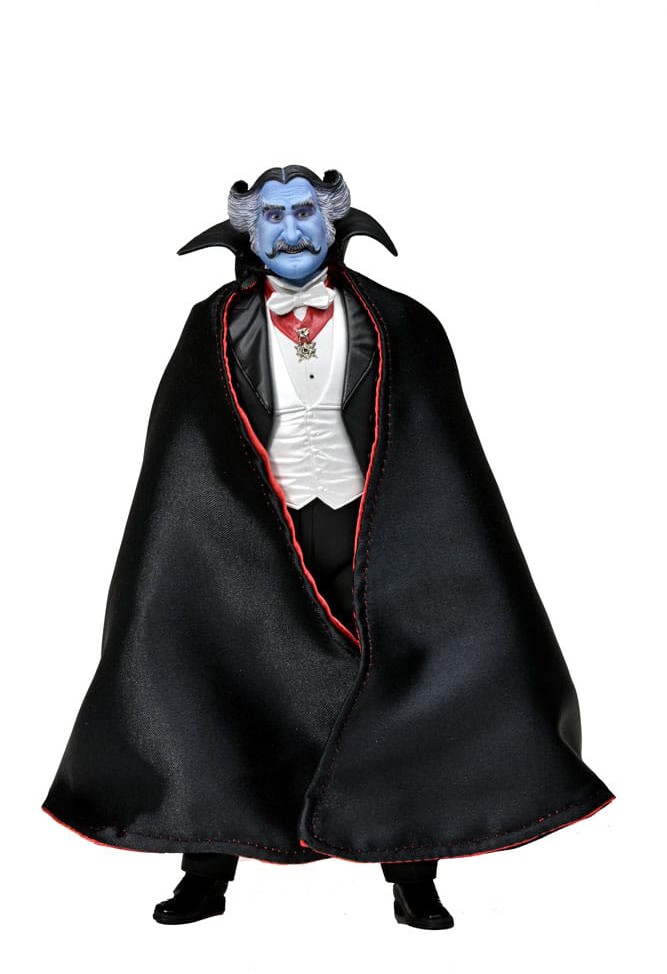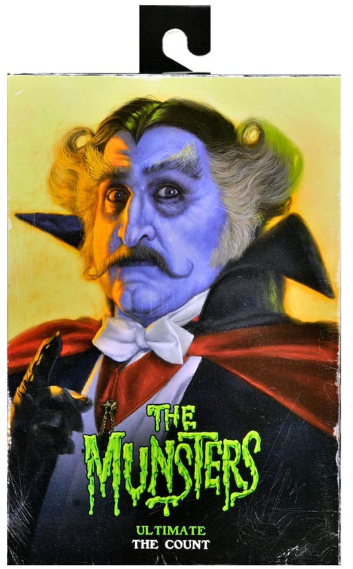 From Rob Zombie's The Munsters, NECA introduces The Count as an Ultimate action figure! This venerable vampire is also Lily's dad (and none too pleased with his daughter's affection for the goofy Herman Munster). This 7" scale action figure is loaded with features and accessories for the discerning collector, like a removable soft goods cape, extra interchangeable head, spade, skull cane, and alternate hands. Comes in display friendly 5-panel packaging with opening front flap featuring custom artwork by Daniel Horne.