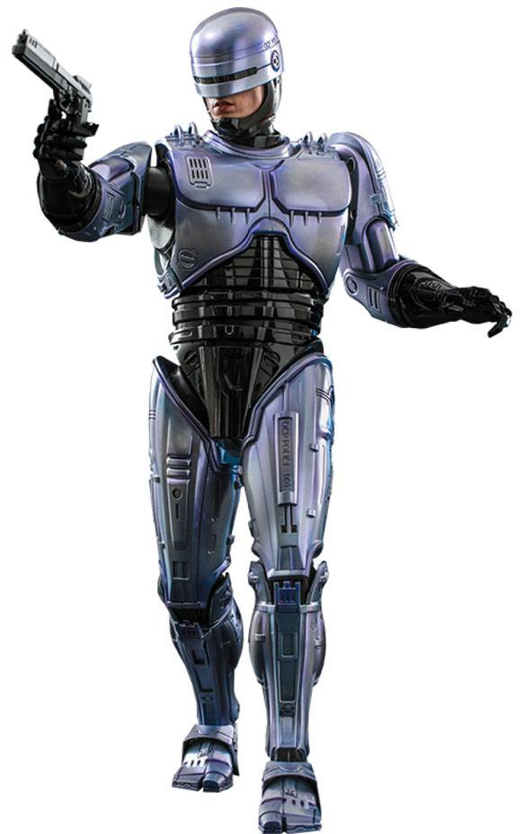 The movie-accurate RoboCop Sixth Scale Figure made in diecast material features a helmeted head with interchangeable lower part of faces capturing different expressions; intricate sections of armor such as a hidden thigh pistol holster; specially applied iridescent colored painting in a purplish blue scheme; a number of greatly-detailed weapons and accessories including a diecast pistol, pistol, multipurpose cannon with missile and blast effect, flight pack, interchangeable hands and figure base.