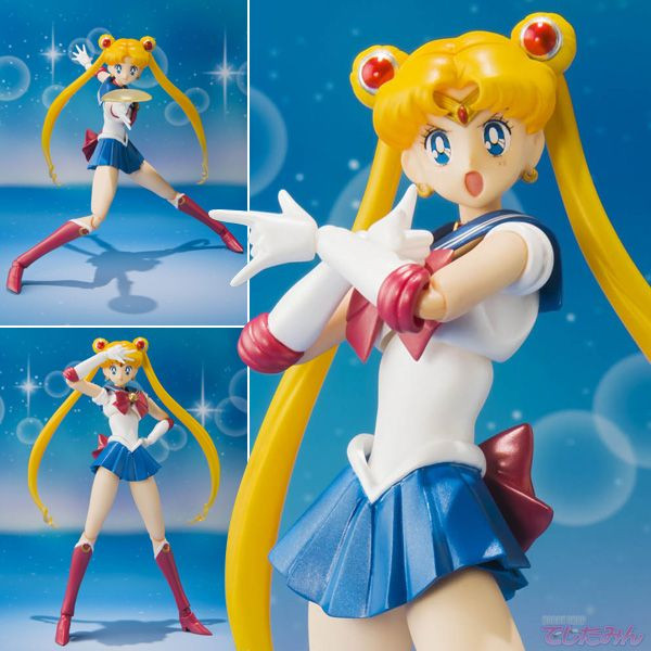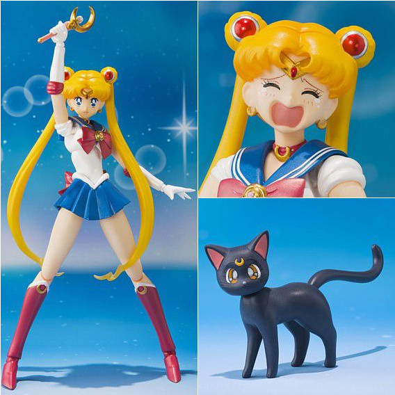 Sailor Moon joins the S.H.Figuarts series in beautiful fighting form with a full array of option parts. Sculpted with elegant proportion S.H.Figuarts Sailor Moon stands on its own as a gorgeous display piece. Meticulous attention to detail has enabled a faithful portrayal, and part of the hair has been rendered with clear parts for enhanced realism. In addition to high-detail and stunning proportion this figure set features advanced articulation for recreation of your favorite Sailor Moon Action scenes. And to top it all off- a wealth of accessories are included! Two types of Moon Sticks (with/without Silver Crystal), effect parts for "Moon Tiara Action", and 8 interchangeable hand parts (3 left, 5 right) will expand the playability of S.H.Figuarts Sailor Moon. Sailor Moon's feline partner, Luna will be included too with neck and tail articulation. Aiming for a superbly expressive Sailor Soldier, in addition to three interchangeable face parts, two added face parts will be included as limited first production issue bonus parts!