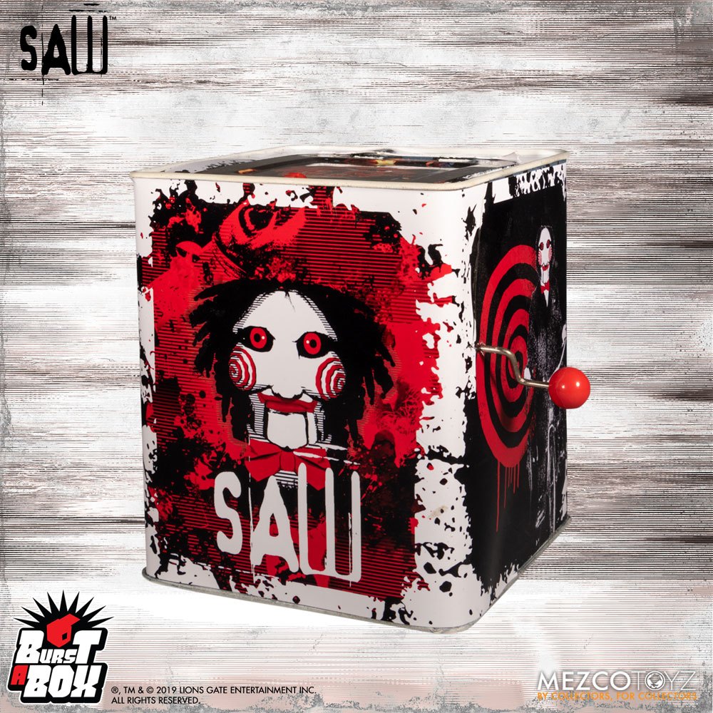 The Saw Burst-A-Box features Billy - the mechanical puppet often used by John Kramer, better known as the Jigsaw Killer.