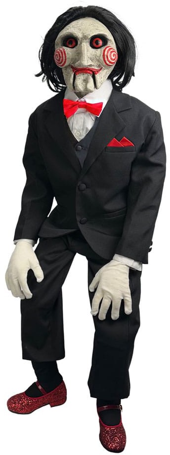 Jigsaw's main accomplice and icon of the film franchise, the officially licensed, Saw - Billy the Puppet Deluxe Prop is a must for any collector. This amazing prop is 1:1 scale features a vinyl head, moving mouth, light-up eyes, posable arms and hands, plush legs and a weighted torso for easy sitting. Pressing the wrist plays 2 sound clips right from the film.