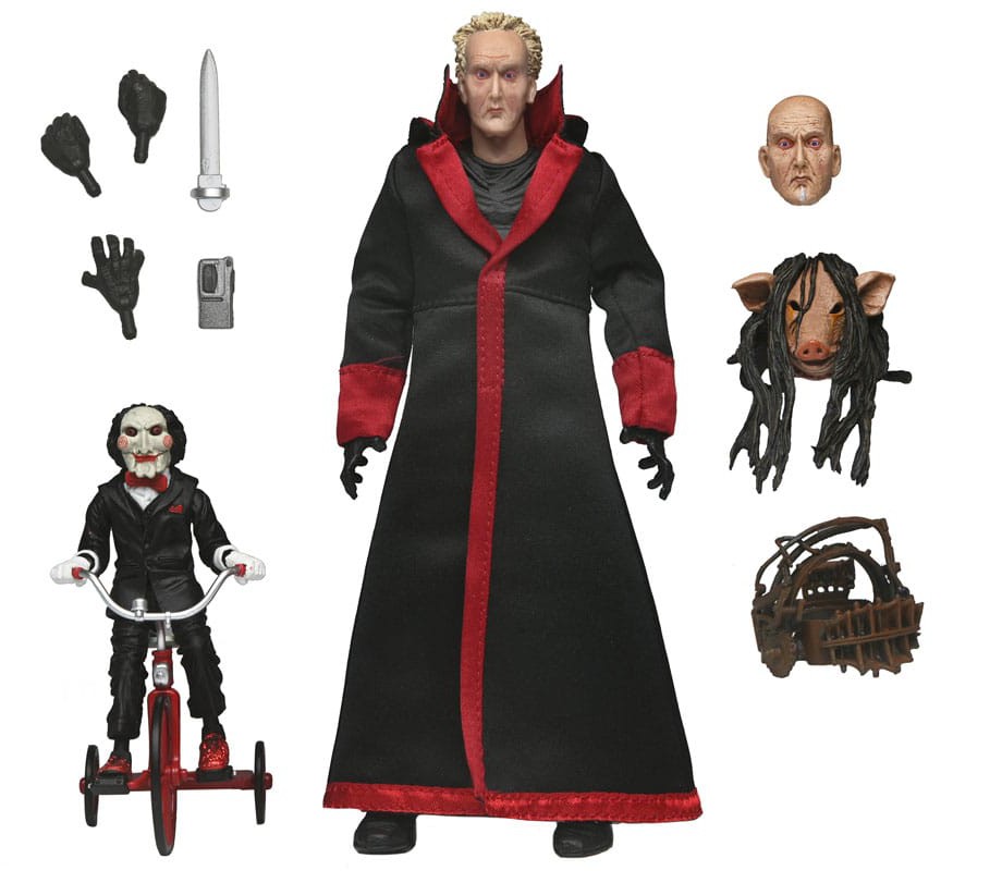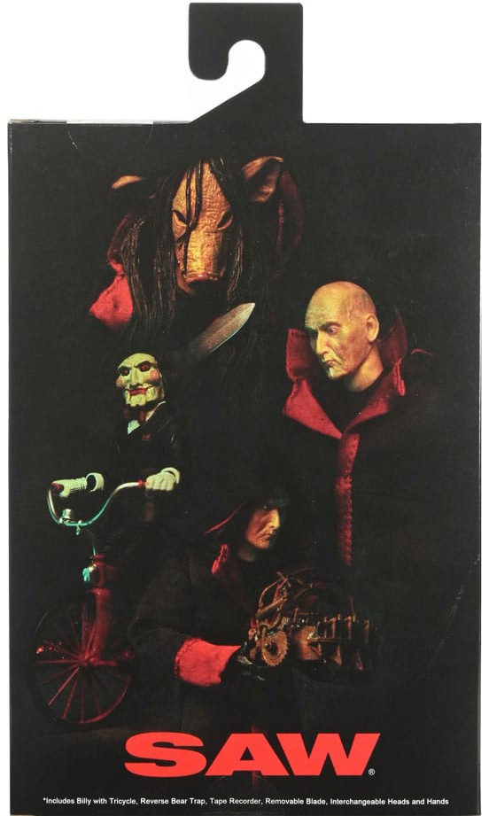 Accessories include: interchangeable heads and hands, pig-mask head, puzzle head-trap, tape recorder, extended blade, and Billy the Puppet with Trike. Collector-friendly window box packaging with opening front flap.