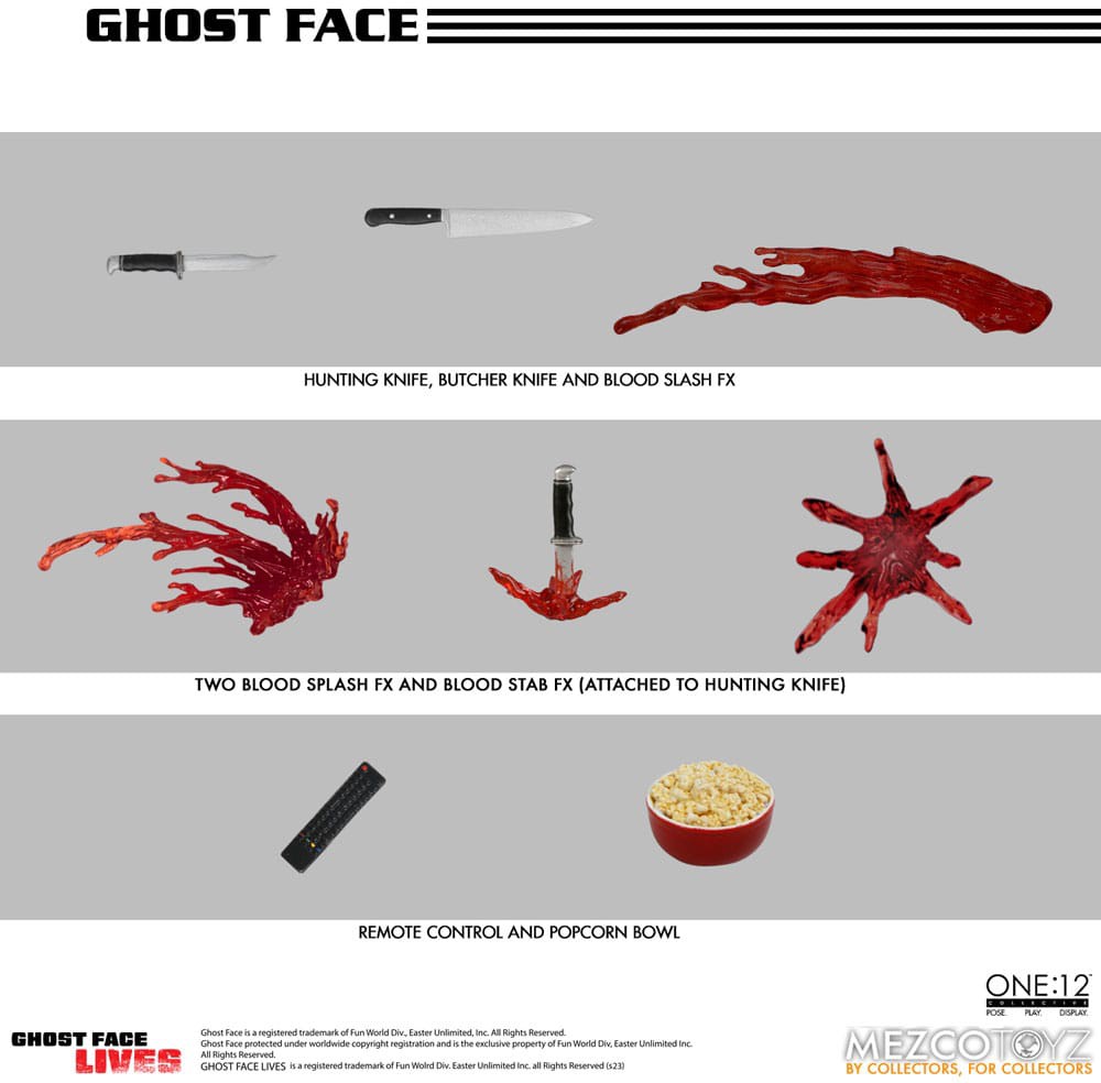 Ghost Face wears his signature black hooded robe, with posable hood and sleeves through integrated posing wire. He swings knives or a reaper's scythe, complete with multiple blood FX that attach to weapons. The mysterious killer also carries a popcorn bowl and a remote control for perfect horror movie nights.