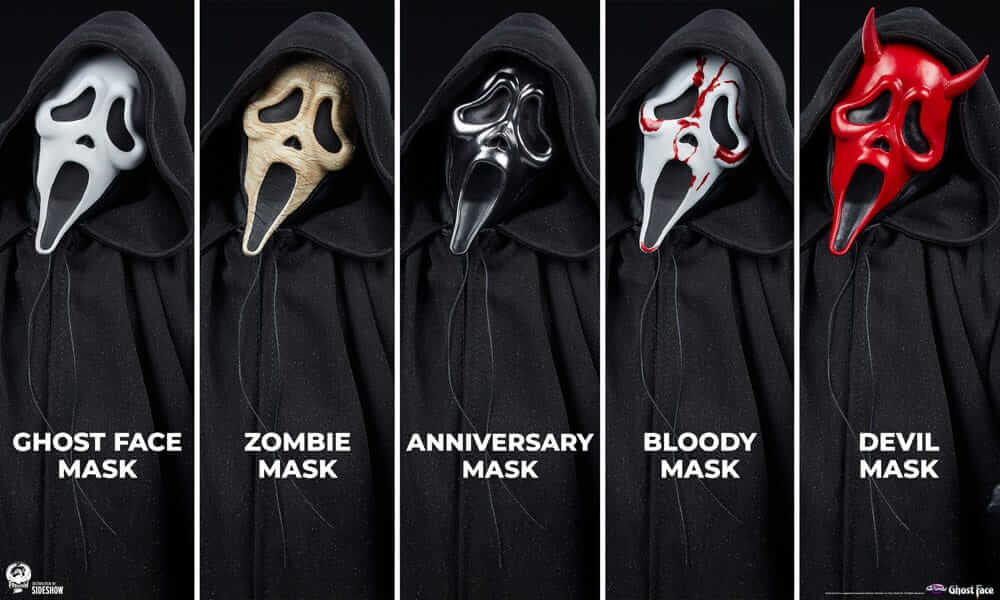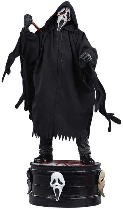 The deluxe statue base is adorned with four equally iconic swap-out masks that can be placed onto the figure for a total of five frightening faces to choose between: the classic Ghost Face Mask, the Bloody Mask, the silver Anniversary Mask, the Zombie Mask, and the Devil Mask. Horror fans don't want to miss this ultimate opportunity to mix and match their favorite looks for this beloved baddie.