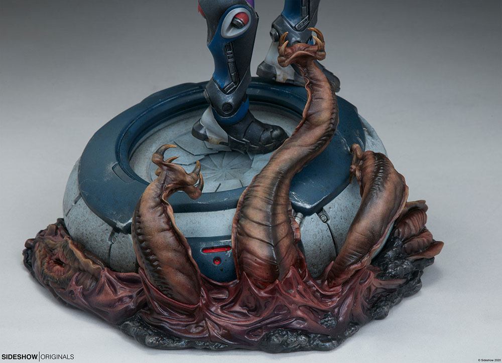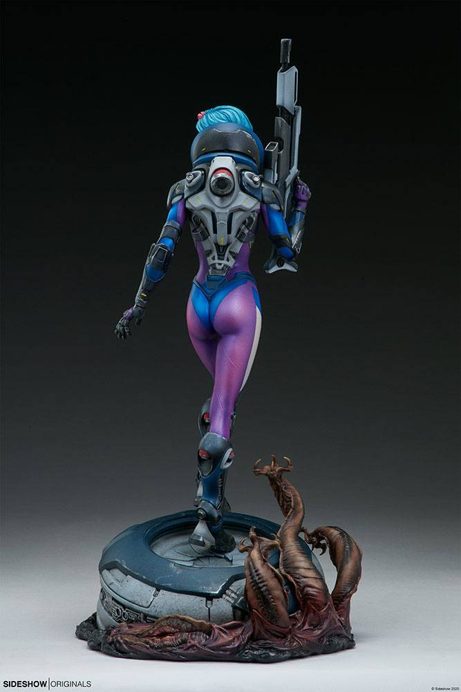 The Bounty Hunter: Galactic Gun for Hire Statue measures 19" tall, swaggering out of her spacecraft after an artful crash-landing on a hostile alien planet. Some of the native fauna doesn't take kindly to the intrusion, reaching up with clawed tentacles to grab at her from beneath the ship. Undeterred, the fearless expert tracker confidently surveys the landscape in pursuit of her target, armed with her trusty blaster and a state-of-the-art space adaptation suit.
