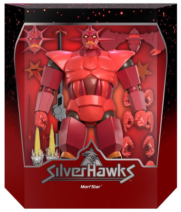"Moon Star of Limbo, give me the Might, the Muscle, the Menace of MON*STAR!" The Mob boss Mon*Star is intimidating enough in his natural state, but transformed into the mighty Armored Mon*Star, he's truly MONstrous! Measuring in at almost 11" to the top of his spikes, the fully articulated Armored Mon*Star ULTIMATES! figure comes with interchangeable heads and hands and a variety of accessories, including his Blaster Rifle and Sky Shadow! Kick off your SilverHawks collection with the cartoon-accurate Armored Mon*Star and the rest of the first wave of ULTIMATES! Figures!