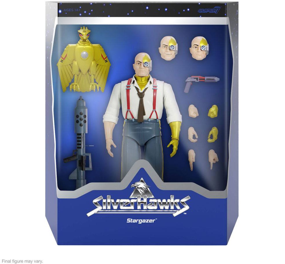 18 cm hög, fullt ledad SilverHawks Ultimates! Commander Stargazer actionfigur med utbytbara huvuden, händer samt tillbehör. Made-to-order.