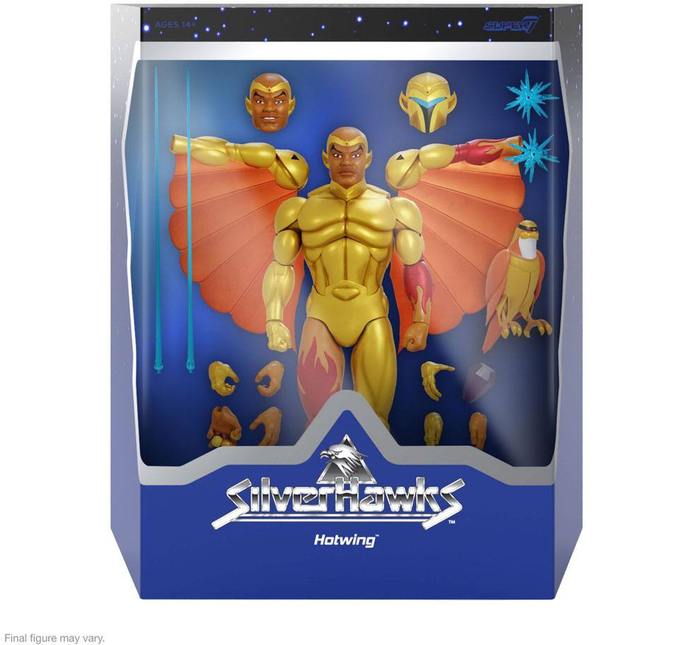 18 cm hög, fullt ledad SilverHawks Ultimates! Hotwing actionfigur. Kommer med utbytbara huvuden, händer samt tillbehör. Made-to-order.