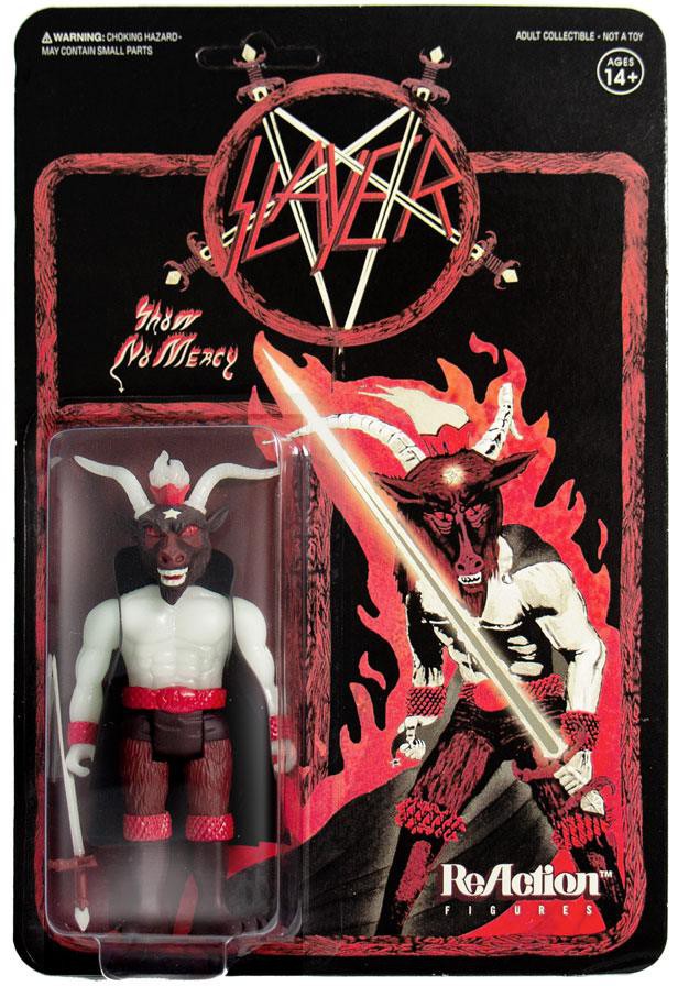 The official Super7 Slayer 10 cm ReAction Figure immortalizing the demonic Minotaur from the cover of the band's debut album, "Show No Mercy". The figure includes a cape and sword accessories.