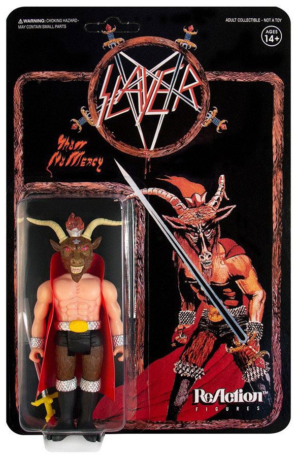 The official Super7 x Slayer 3.75-inch ReAction Figure immortalizing the demonic Minotaur from the cover of the band's debut album, "Show No Mercy". The figure includes a cape and sword accessories.