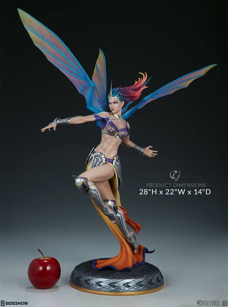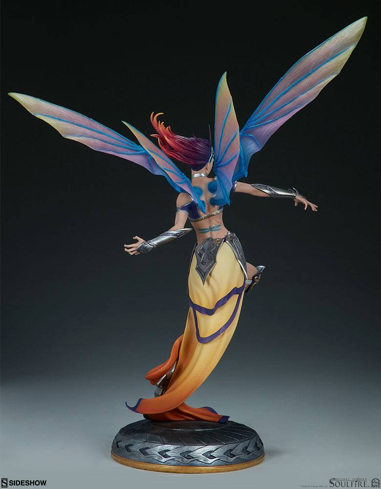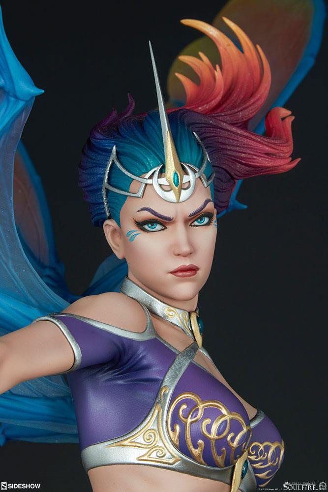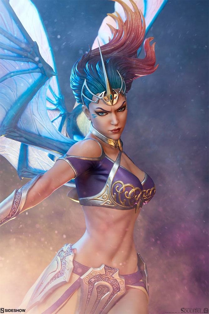 The Grace Premium Format™ Figure measures 71 cm tall with a 56 cm wingspan, as the powerful Rahtumi soars over a silver and gold base engraved with swirled markings. This dazzling and dynamic resin statue features a fully sculpted costume with a flowing yellow ombré skirt and a purple top detailed with gold accents. Grace is protected in intricately detailed silver armor including vambraces, greaves, and tassets all accented with gold and purple filigree.