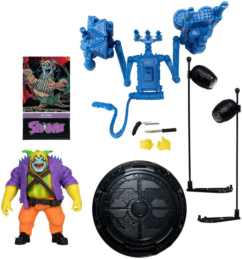 - The Clown includes backpack rocket launcher, knife, razor blade , alternate hands, and battery-powered black lights base