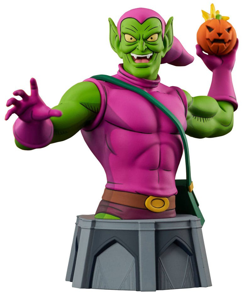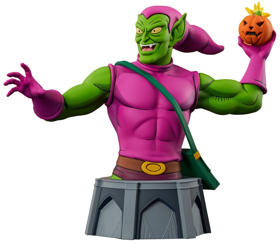 Akta dig, Spider-Man! Green Goblin är på jakt, och han har en pumpabomb med ditt namn på! Denna minibust i skala 1/7 av Norman Osbornes alter ego är baserad på skurkens framträdande i Spider-Man: The Animated Series. Den är cirka 15 cm hög och har detaljerad skulptering och färgapplikationer i animerad stil. Den är begränsad till endast 3 000 exemplar och levereras med ett numrerat äkthetscertifikat i en fönsterlåda i fullfärg. Designad av Barry Bradfield, skulpterad av Alterton!