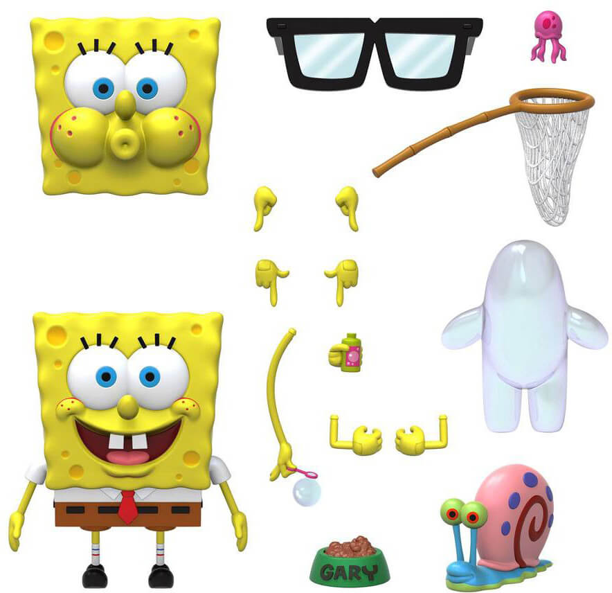 If there was a face of eternal optimism it would be as absorbent and yellow and porous as he. SpongeBob SquarePants' irrepressible spirit is a beacon of unrepentant joy in an increasingly jaded world. This made-to-order, 7" scale fully articulated SpongeBob SquarePants ULTIMATES! figure of SpongeBob comes with interchangeable heads, arms, hands, plus a variety of accessories including Gary, his Bubble Buddy, a jellyfish, and more! If you're a big fan of the nautical nonsense and under-sea shenanigans that is SpongeBob SquarePants, you're not going to want to pass up the chance to add the ULTIMATES! figure of SpongeBob to your Bikini Bottom collection!