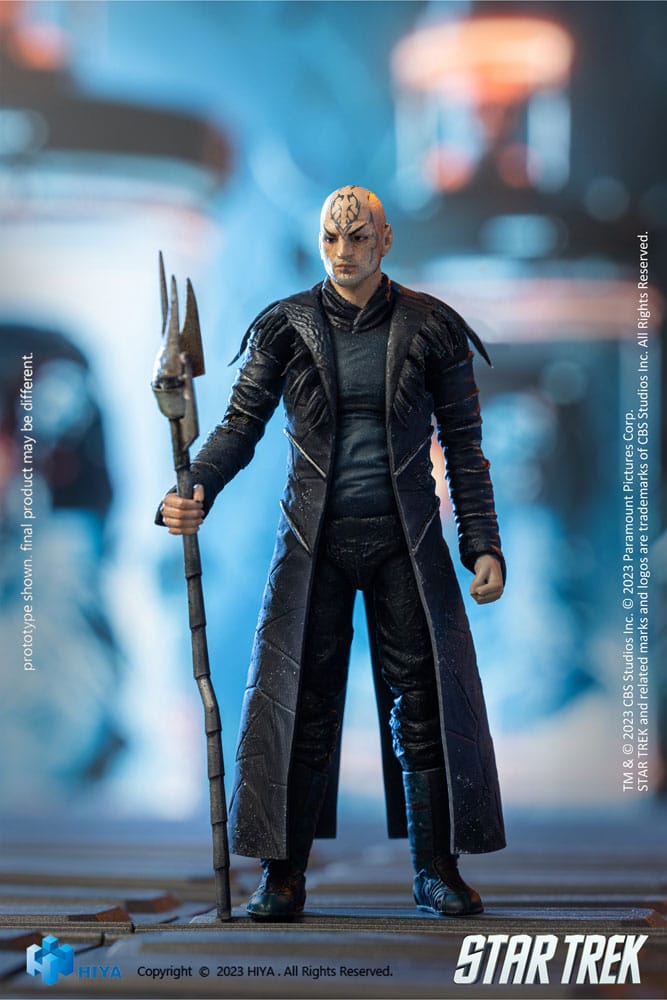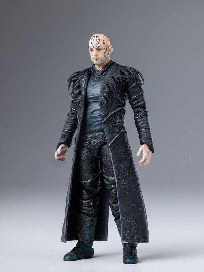 EXQUISITE MINI Series Nero action figure stands at 104mm in height, faithfully capturing his appearance from the "Star Trek 2009" film. Nero appears strong and imposing, with mysterious tattoos on his head and clad in a black leather jacket. The intricate details of his attire, the Romulan long-handled weapon, and hand crossbow accessories are meticulously crafted, even in the 1/18 scale.