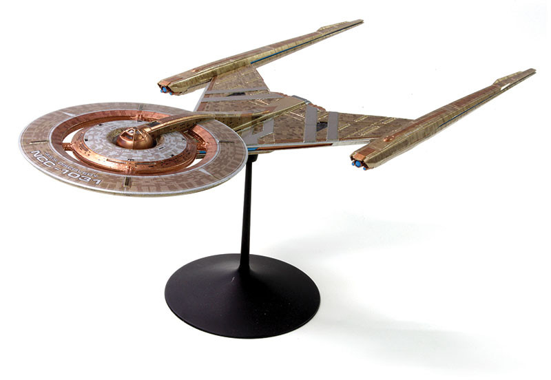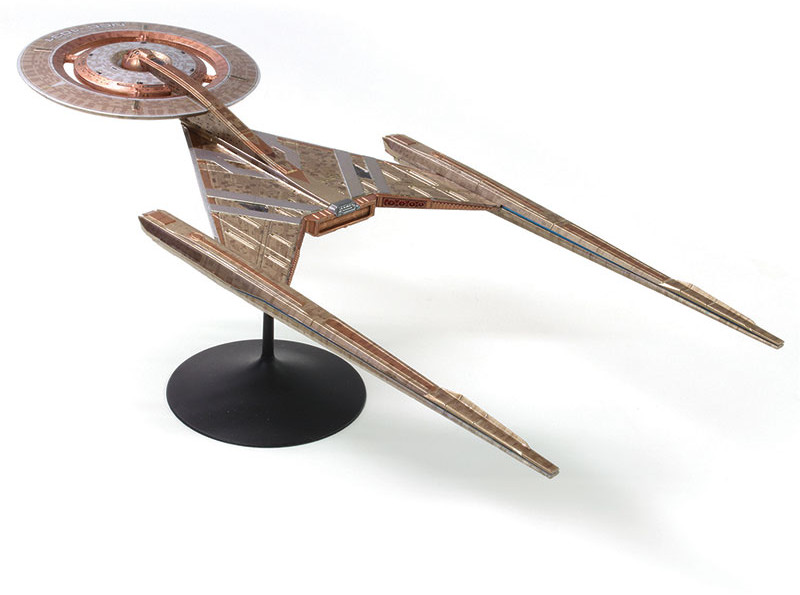 The Capital ship from the new Star Trek Discovery TV-show. The kit comes with full Aztec decal wraps that provide every detail of the ship and includes clear parts for lighting effects. The completed ship model is approx. 30 cm long in a 1/2500 scale. No cement or glue required, painting optional, parts molded in metallic tan.