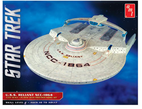 The Star Trek II U.S.S. Reliant NCC-1864 1:537 Scale Model Kit plastic model kit of the U.S.S. Reliant measures 18-inches long and 11-inches wide. It is molded in off-white and clear and includes a dome-style base featuring a metal support rod. Ship registry and marking decals are included.