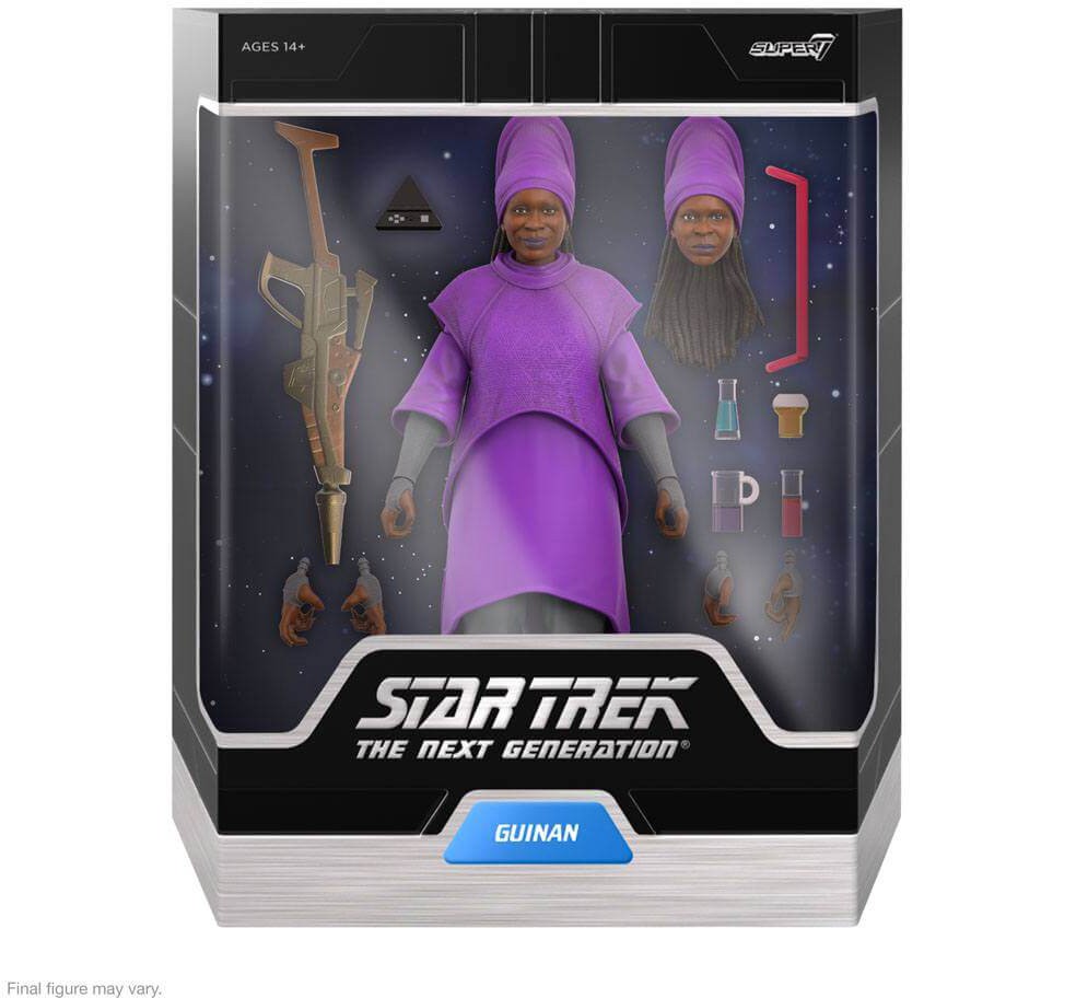 As the sage bartender of Ten Forward, Guinan always seems to have the knowledge needed to help the crew of the U.S.S. Enterprise! This 7" scale Star Trek: The Next Generation ULTIMATES! figure of Guinan features multiple interchangeable heads & hands as well as her rifle, glassware, serving tray, and Pyramid Game. You don't need to have the wisdom of an El-Aurian to know that this made-to-order Star Trek: The Next Generation ULTIMATES! figure of Guinan will improve the disposition of your collection faster than a shot of Aldebaran whiskey!
