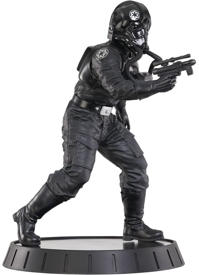 A Gentle Giant Ltd. Release. Move over, stormtroopers -- it's the TIE Pilot's time to shine! This 1/6 scale statue of an Imperial TIE Fighter Pilot depicts him dashing to his fighter so he can engage the enemy. Measuring approximately 12" tall, he carries a small blaster in case he encounters any resistance along the way -- in fact, he has interchangeable E-11 and SE-14r blaster pistols! Limited to only 1000 pieces and hand-numbered on the base, it comes packaged with a matching certificate of authenticity in a full-color numbered box.