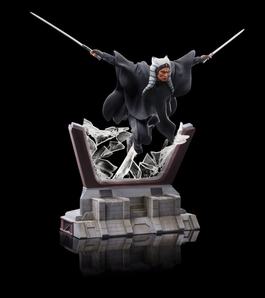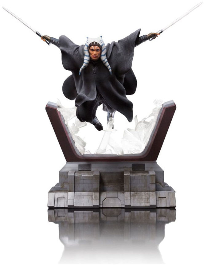 Precis som en rovfågel som är redo att fånga sin föda hoppar den paria Force-sensitiva krigaren genom ett fönster medan hon öppnar armarna, svingar två olika stora ljussvärd med sin kropp täckt av en svart poncho, hon attackerar med precision och koncentration och håller ögonen fokuserade på sitt mål. Efter att ha blivit felaktigt anklagad av Anakin Skywalker, som tidigare utbildat henne i jediriddarnas metoder, förlorade hon förtroendet för dem hon litade på, men hon övergav aldrig målet att använda sina gåvor för att skapa ordning, rättvisa och fred i galaxen. Inspirerad av hennes egen serie som produceras och finns tillgänglig på streamingtjänsten Disney+ presenterar Iron Studios statyn "Ahsoka Tano Deluxe - Ahsoka series - Art Scale 1/10" i en speciell festutgåva för serien, numrerad och begränsad till 999 statyer.
