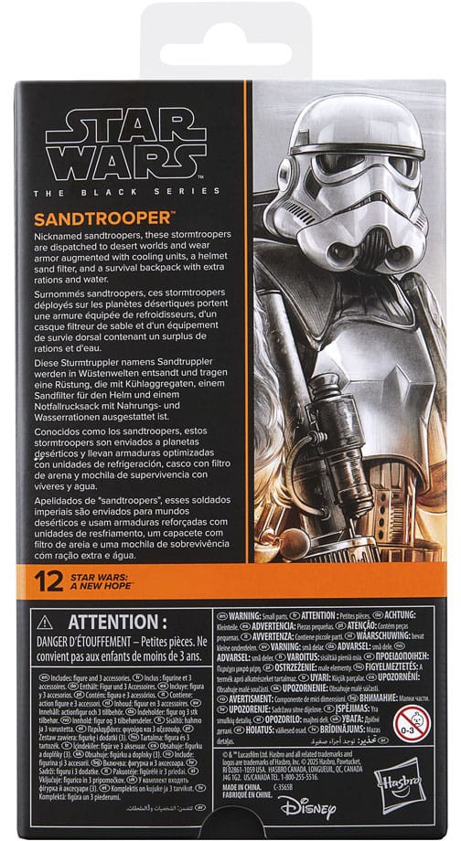 Star Wars The Black Series includes 6 inch action figures, vehicles, and roleplay items from the 40-plus-year legacy of the Star Wars Galaxy, letting fans create galactic scenes with a faithfulness to Star Wars comic books, movies, series, and more. This Star Wars Hasbro action figure is detailed to look like a sandtrooper from Star Wars: A New Hope. With exquisite features and decoration, The Black Series embodies the quality and realism that Star Wars devotees love. May the Force be with you!