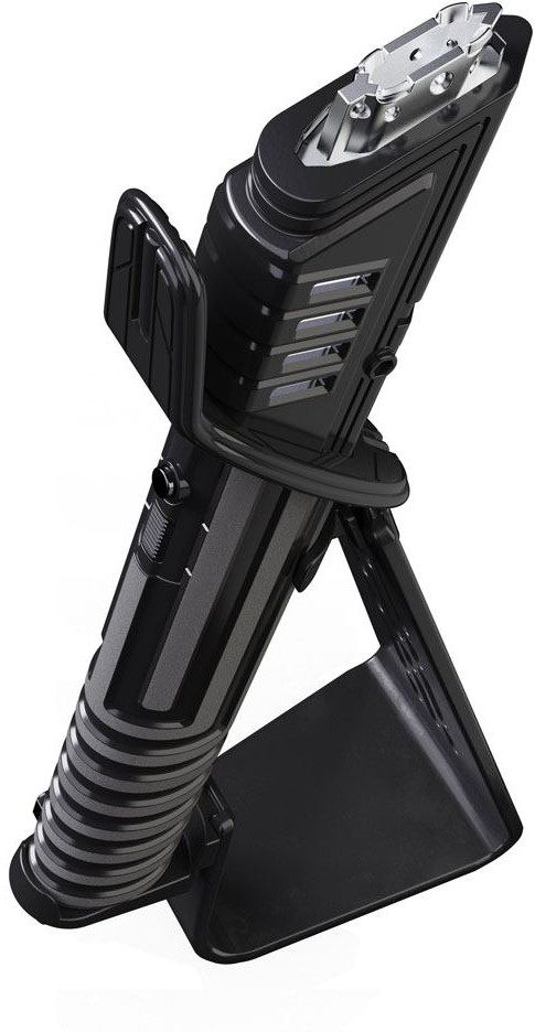 Det slitstarka metalliska hålet har design och deco baserat på Darksaber som ses i live-action-serien The Mandalorian på Disney Plus. Visa denna Mandalorian Darksaber Force FX Elite Lightsaber stolt i vilken Star Wars-samling som helst med det medföljande stativet, med eller utan det löstagbara bladet