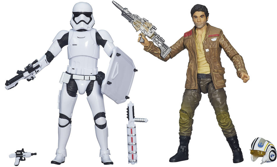 From Hasbro's 6-inch Black Series comes this exclusive action figure 2-pack including Poe Dameron and a First Order Riot Control Stormtrooper. Both stand approx. 15 cm tall and come with accessories in a window box packaging.