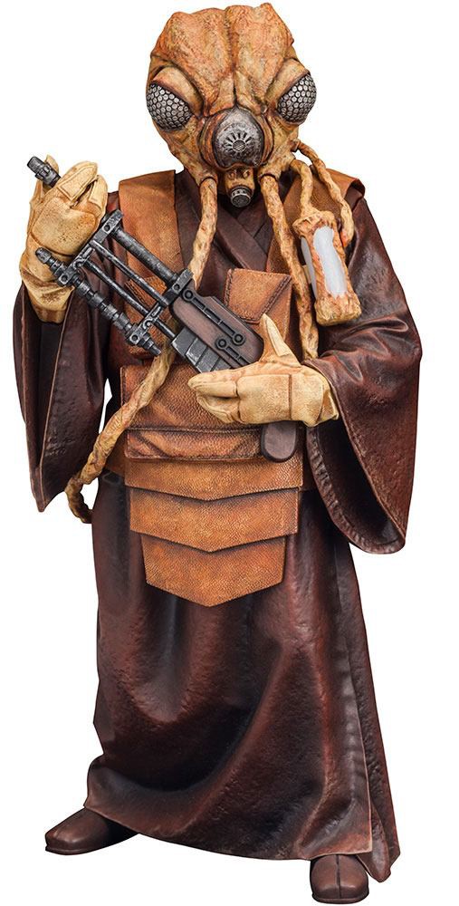 ARTFX+ Statues are fun-to-assemble pre-painted snap-fit kits that can be put together easily in seconds without glue or modeling skill. The magnets in Zuckuss's feet provide perfect stability on the included metal display base. Collect all five classic bounty hunters (4-LOM, Dengar, IG-88, Bossk, and Zuckuss) to assemble a complete statue of Boba Fett with included bonus parts!
