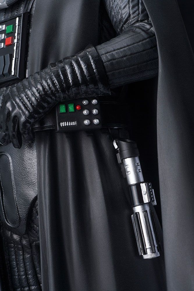 Darth Vader is presented in his original costume as seen in STAR WARS Episode IV: A NEW HOPE. Vader stands in a commanding pose, the lights on his chest plate and belt doing little to penetrate the dark aura of his presence.