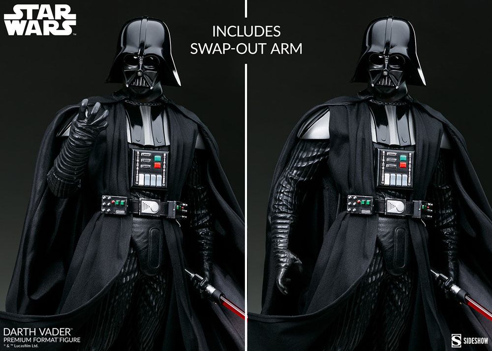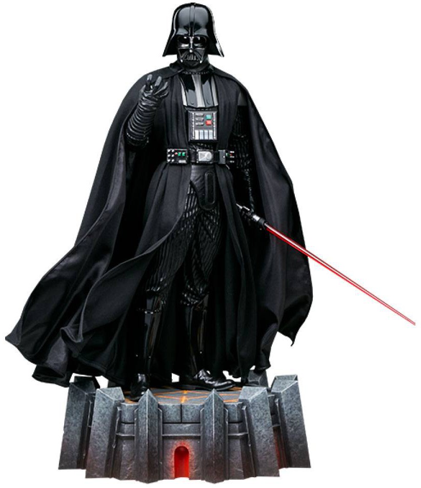 Darth Vader Premium Format-statyn i resin har en detaljerat skulpterad rustning tillsammans med noggrant skräddarsydda tygelement för att ge djup och drama till statyn. Produkten innehåller två utbytbara högra händer för alternativ display, en sänkt vid hans sida och en höjd i en kraftfull gest.