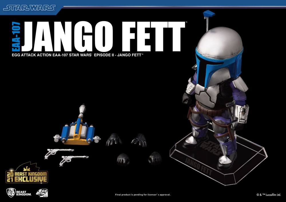 EAA-serien med 6-tums, mycket ledade actionfigurer under Beast Kingdom's 'Entertainment Experience Brand' tar fans av den ursprungliga klontruppen till en helt ny designnivå. Jango Fett EAA-027 är en exakt designad figur med äkta tyg som används för underrustningskläderna. Den yttre metallfärgade rustningen är också sliten för att visa den stridshärdade prisjägaren.