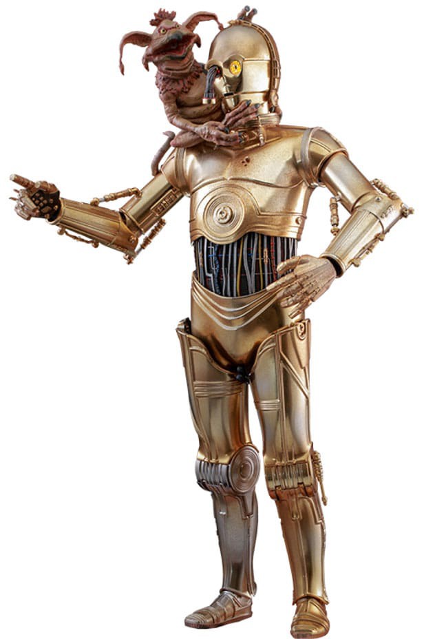 C-3PO Sixth Scale Figure är tillverkad av pressgjutet metallmaterial och har en detaljerad mekanisk konstruktion, skickligt applicerade metalliska färgapplikationer, LED-ljusögon, ett utbytbart skadat ansikte, en specialdesignad Star Wars actionfigurbas och Jabba the Hutt's vidriga husdjur Salacious Crumb™.