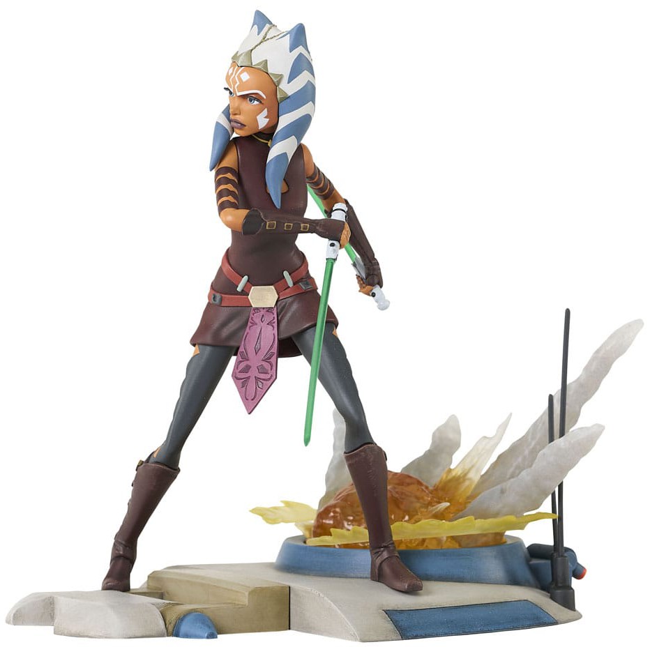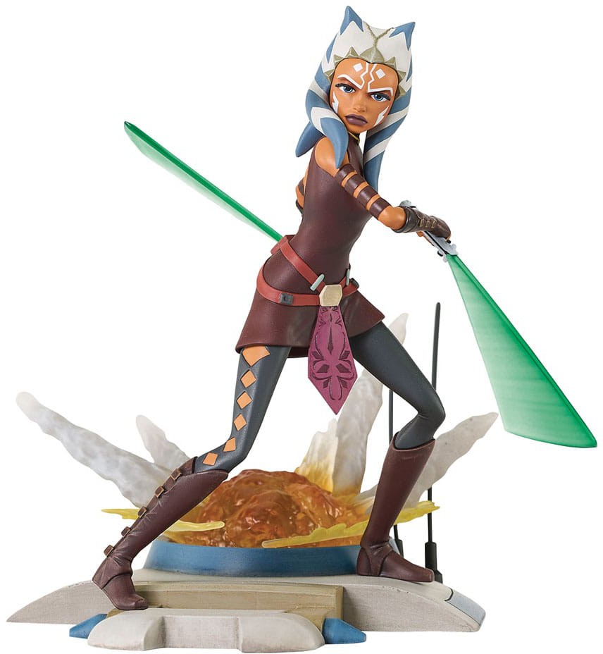 The Padawan attacks! Ahsoka Tano swings her two lightsabers in front of an explosion as the latest Star Wars Gallery PVC statue! Made of high-quality PVC, this approximately 8-inch statue features interchangeable moving and non-moving lightsaber blades. It comes packaged in a full-color window box.