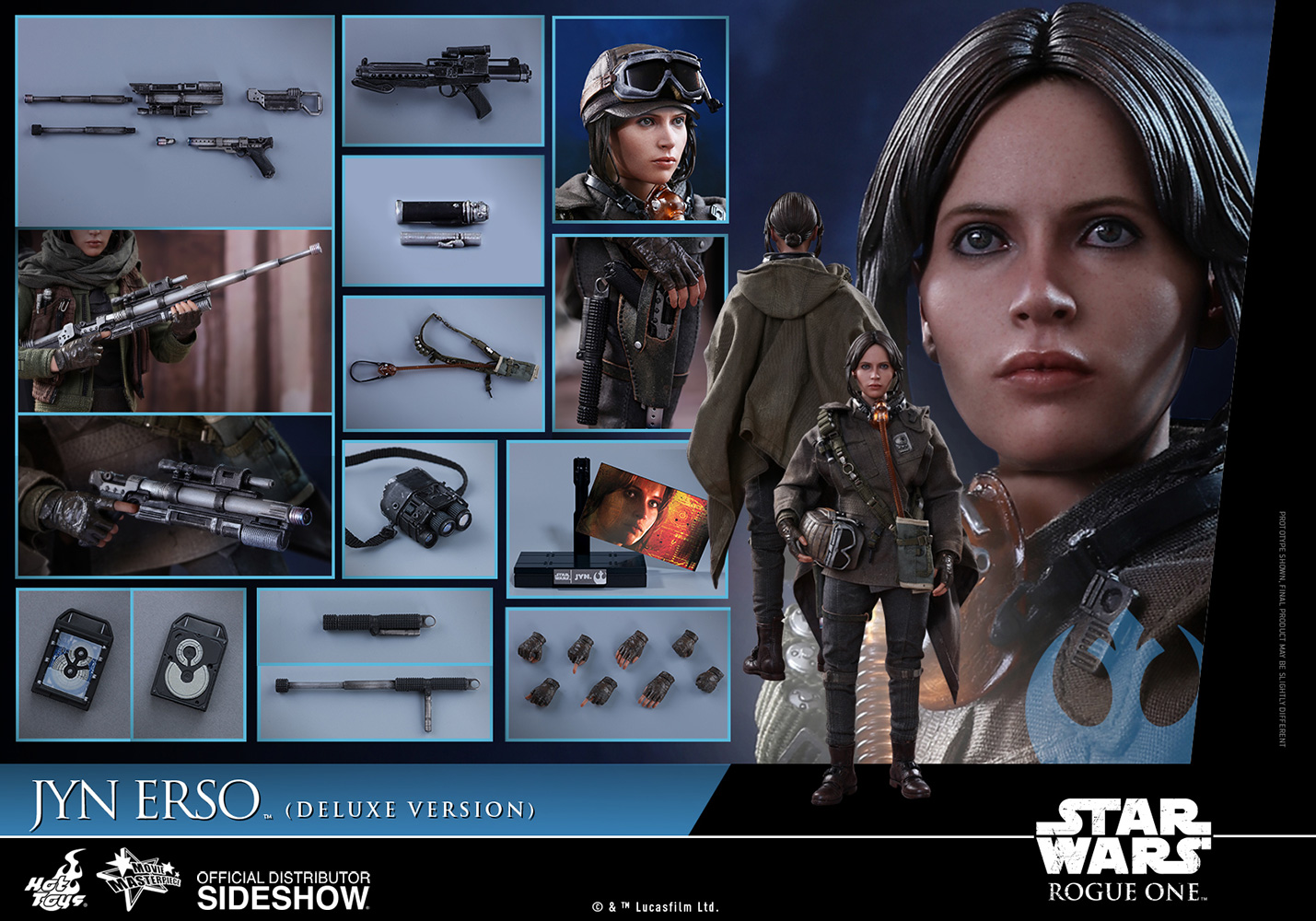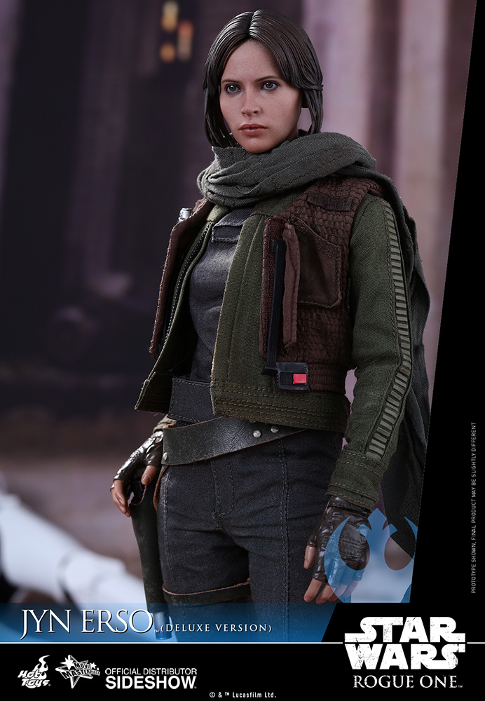 Sideshow and Hot Toys are very excited to officially introduce a Deluxe Version of the widely anticipated sixth scale Jyn Erso collectible figure! Meticulously crafted based on the appearance of Felicity Jones as Jyn Erso in the film, the highly life-like collectible figure features a newly developed head sculpt, sophisticatedly tailored costume with multiple layers, detailed weapons and accessories including a blaster pistol, fighting baton, E-11 blaster rifle, and figure stand.