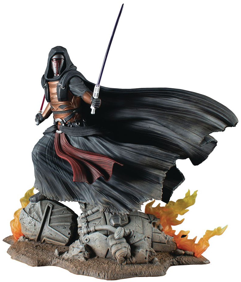 A Gentle Giant LTD release! As seen in Star Wars: Knights of the Old Republic, the Sith (or Jedi?) Darth Revan stands atop a flaming statue with two lightsabers and a flapping robe in this all-new Gallery Diorama by Gentle Giant LTD. Featuring detailed sculpting and paint applications, including translucent flames and lightsaber blades, it is made of high-quality PVC and comes packaged in a full-color window box.