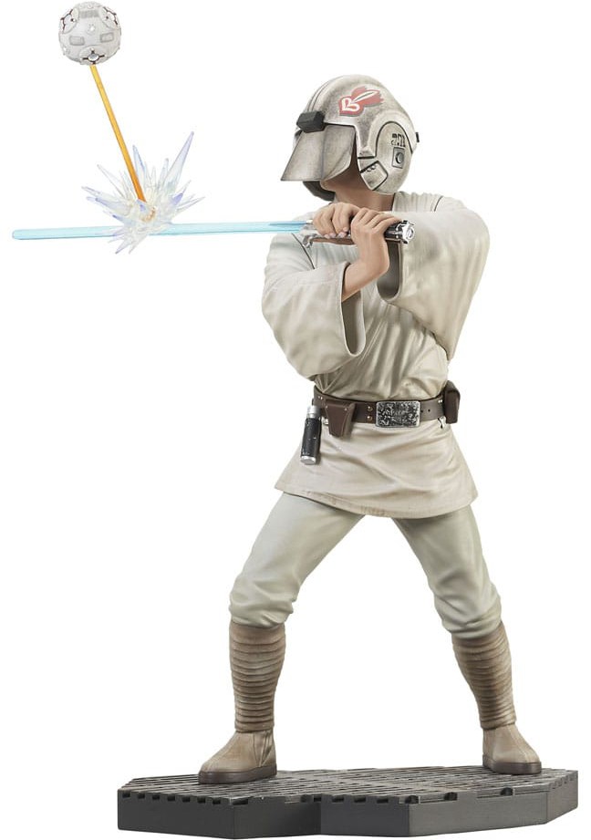 Release! Use the Force, Luke! The young Skywalker takes his first swing at lightsaber training in this all-new 1/6 scale statue from Gentle Giant Ltd.! Capturing the famous scene aboard the Millennium Falcon, this statue features interchangeable helmeted and unhelmeted heads, as well as interchangeable lightsaber blades, so he can deflect a shot from the training droid! Limited to only 1000 pieces. It comes packaged with a numbered certificate of authenticity in a full-color box.