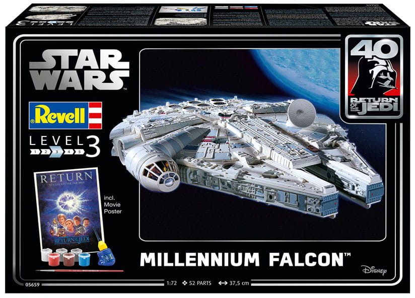 Fira 40-årsjubileet av den klassiska filmen "Return of the Jedi" från 1983 med denna specialutgåva av Millennium Falcon-presentförpackning! Millennium Falcon var ett kraftigt modifierat lätt fraktskepp av typen YT-1300 som ägdes av korellianen Han Solo efter många ägarbyten. Denna detaljerade modellsats i skala 1/72 med 52 delar har en rörlig ramp, genomskinliga delar, roterande antenn, pilotfigurer och möjlighet att bygga med förlängda landningsben eller slutna kajer. Den levereras också med en affisch, lim, penslar och viktiga färger så att du kan komma igång direkt. Den perfekta presenten för alla "Star Wars"-fans och nyblivna modellbyggare!