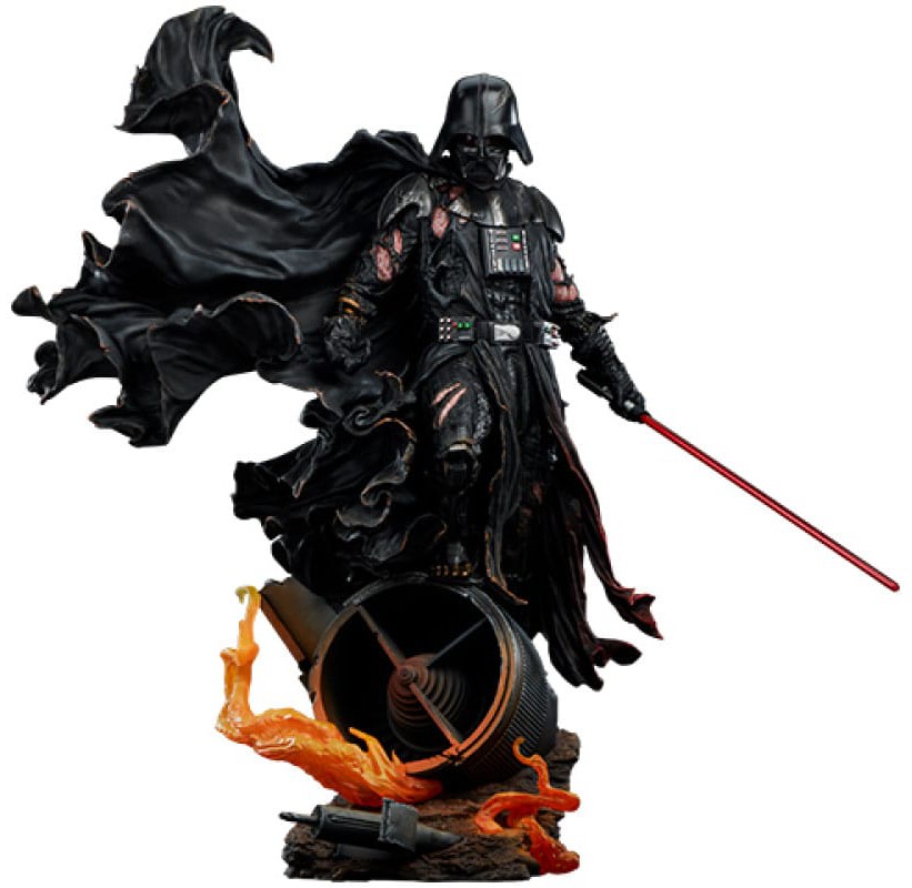 Sideshow presents the Darth Vader™ Mythos Premium Format™ Figure. This sinister Star Wars™ collectible fully embraces the power of the dark side. As a collection, Sideshow's Mythos series showcases fine art collectibles that allow the collector to imagine what could have been, but maybe never was. Myths meant to be initiated by the eye and completed by the mind. Measuring 30" tall, 28.5" wide, and 15" deep, the Darth Vader™ Mythos Premium Format Figure depicts Vader standing atop the flaming wreckage of a Rebel X-Wing engine. The menacing Sith Lord is battle-worn but not backing down until he claims victory for the Galactic Empire. With lightsaber drawn and his armor in disarray, the dreaded villain shrugs off enemy fire while channeling his fearsome Force powers. This quarter scale Darth Vader collectible features a fully sculpted helmet and costume recreating both the intricate hardware of the character's cybernetic life support systems and the dynamic, flowing movement of his windswept robes and cape. Detailed tatters and tears in his black uniform reveal the burns he sustained during his most fateful duel as well as the mechanical limbs gifted to him by his new master, Darth Sidious. The striking paint applications on Vader's costume also reflect the glowing flames and the red lightsaber, giving depth and dimension to the scene. Additionally, the Darth Vader™ Mythos Premium Format Figure includes light-up aspects in the belt box, chest box, lightsaber, and base, allowing the fire to burn bright as Vader descends to crush his enemies. Triumph over the Rebellion and let the Darth Vader™ Mythos Premium Format Figure rise above your collection today! Product size: 76 x 72 x 38 cm
