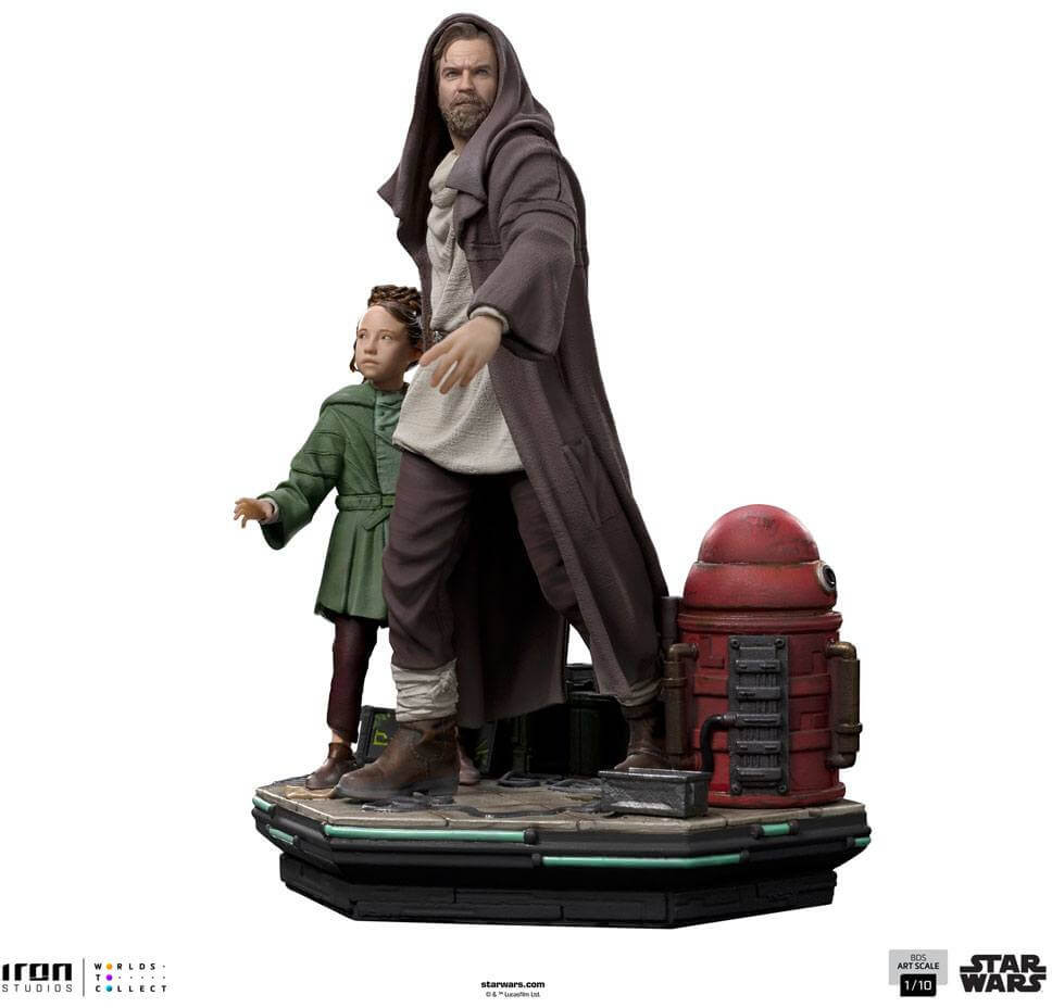 Through the chaotic streets of planet Daiyu, under the lights of tall buildings, luminous signs, and the eyes of mercenaries and relentless agents of the Galactic Empire, the former brave Jedi Master risks himself leaving his anonymity to fulfill at any cost his mission of rescuing the young princess from planet Alderaan and get her back in safety to her foster father. After saving and earning the intrepid and fearless girl's trust, with her by his side wearing a green cloak bringing her small droid called Lola in one of her hands, and he alert, using a hooded cape to hide his identity, they both search for an escape route to fulfill their mission. Directly from the Star Wars spin-off series released on streaming service Disney+ in 2022, Iron Studios present their diorama statue "Obi-Wan and Young Leia Deluxe- Obi-Wan Kenobi - Art Scale 1/10", with the Jedi hero, master of Anakin Skywalker, next to his protectee, daughter of his former apprentice.