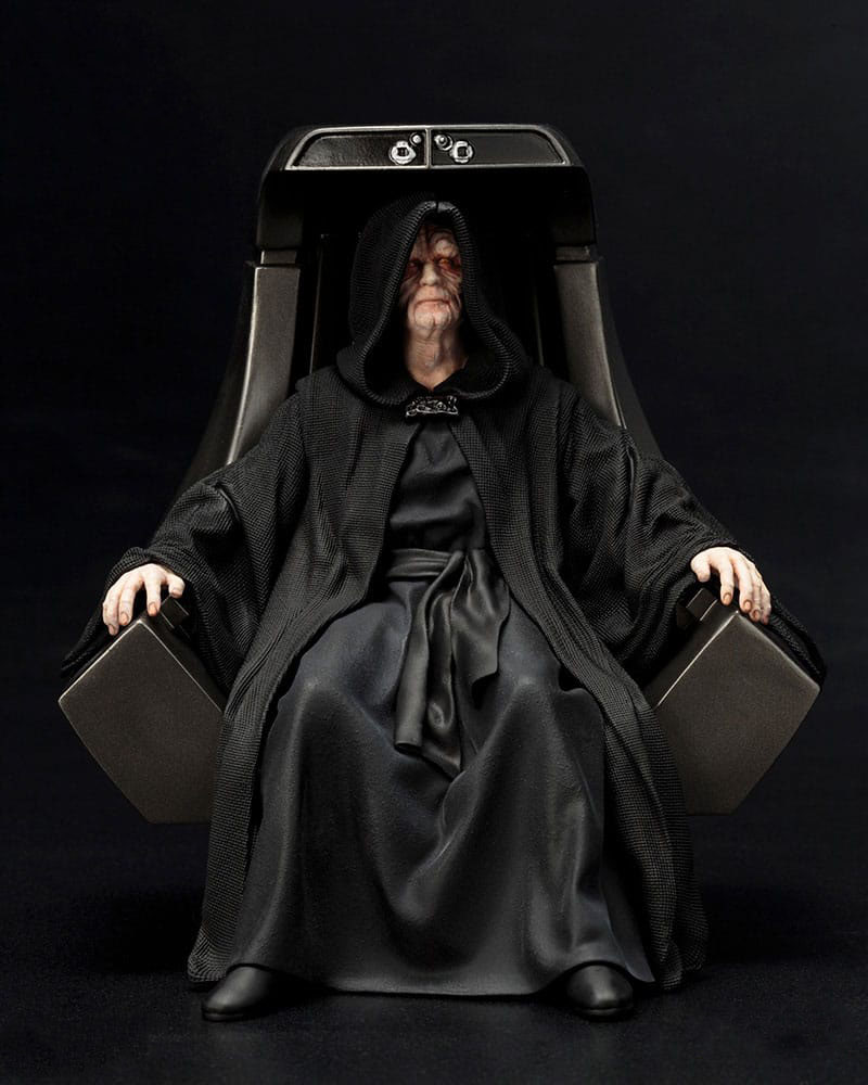 Kejsaren av det galaktiska imperiet återvänder! Kejsar Palpatine, även känd som Darth Sidious, som skapade förödelse som den största skurken, dyker upp igen i Kotobukiyas Star Wars ARTFX+-serie. Rynkorna i hans ansikte under den becksvarta manteln, de olycksbådande glödande ögonen som är typiska för Sith och tronen som han sitter på i en värdig pose har alla återskapats in i minsta detalj i skala 1/10.