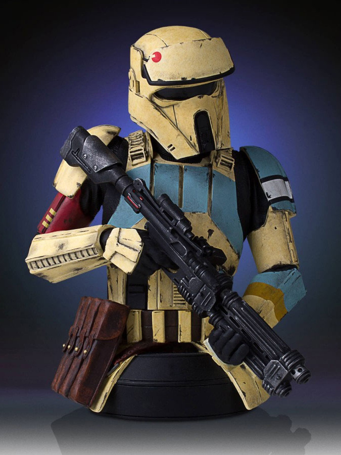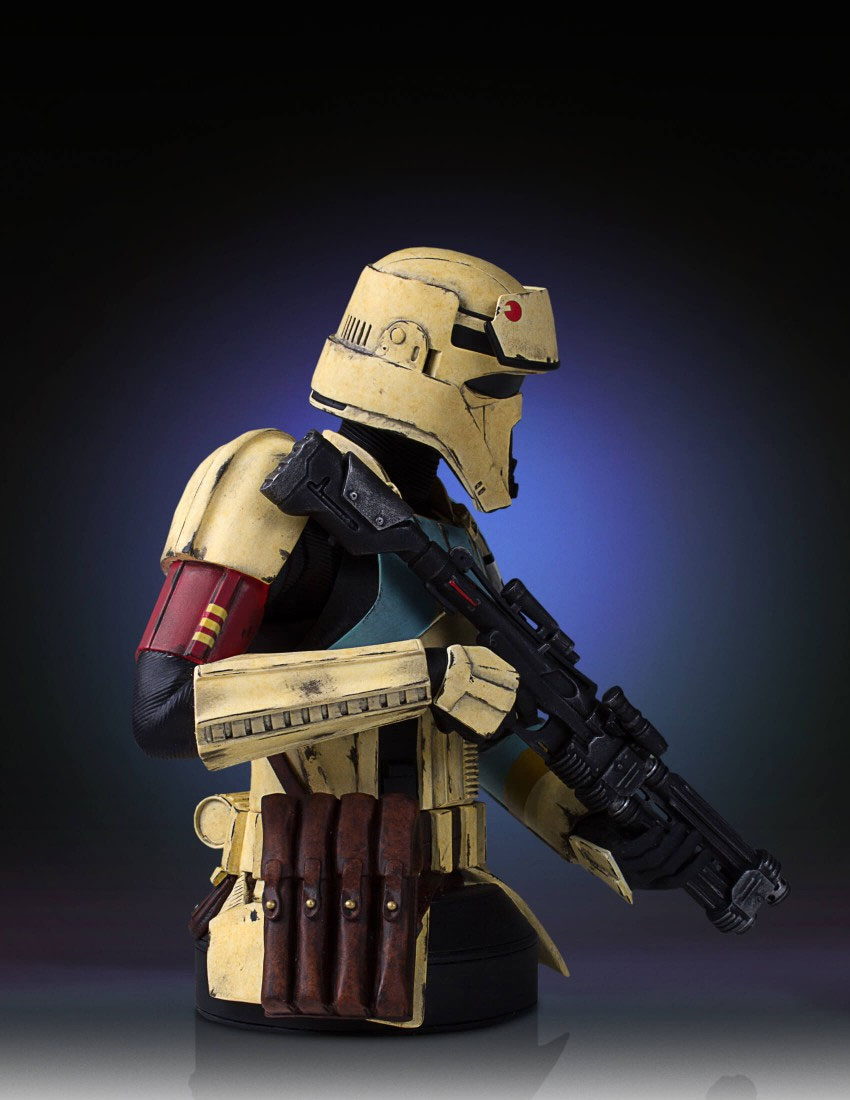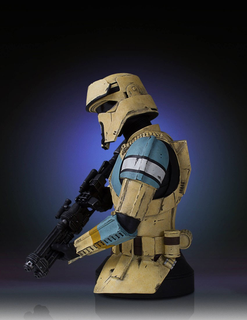 Sculpted digitally to ensure precision form and character correct accuracy. Each detailed bust is cast in durable, stone-like, poly-urethane material that is cold to the touch. Featuring a heavy blaster-rifle, sculpted hip pouches and gear. Every trooper is hand painted with correct rank and insignia applications with battle worn, weathered details.