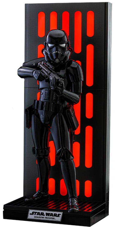 Sideshow och Hot Toys är glada att introducera Shadow Trooper Sixth Scale Collectible Figure, den levereras med bra artikulering, skickligt applicerade färgapplikationer, en tygunderdräkt och ett blastergevär, tillsammans med en LED-ljus upp Dödsstjärnan väggpanel miljö bakgrund i en Star Wars samlaruppsättning för Star Wars fans!