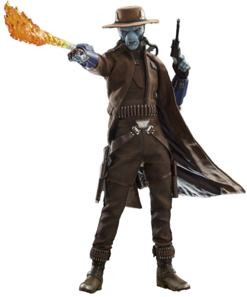 This Star Wars collectible figure features a newly developed head sculpt with astonishing likeness, meticulously tailored hat and outfit, wired long coat for a variety of posing, a pair of blaster pistols, a flamethrower effect, and a display base.