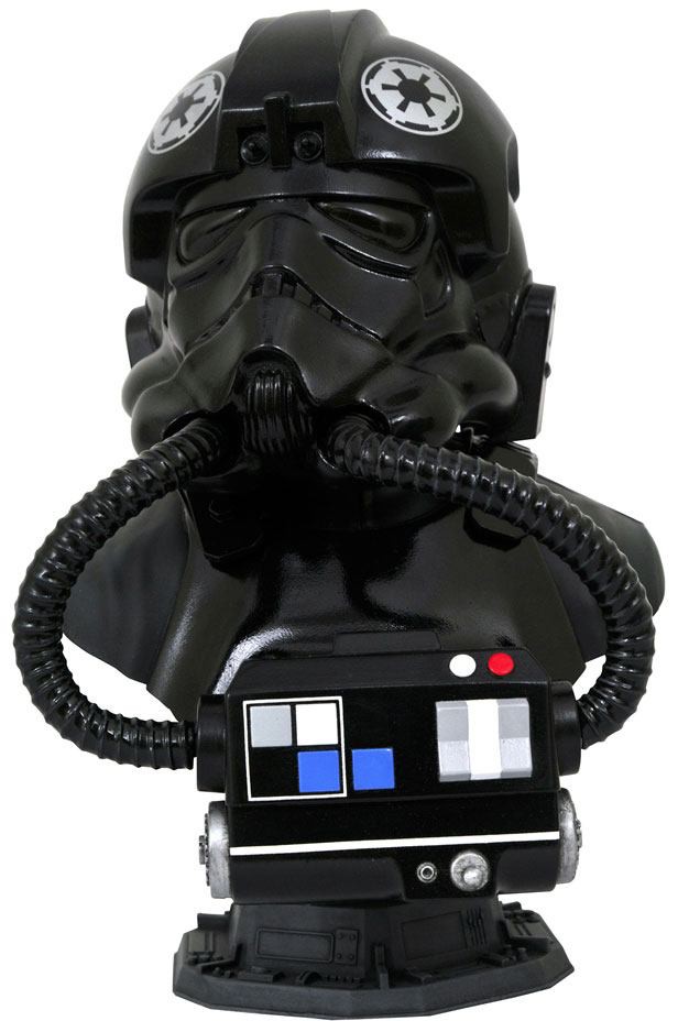 Watch out, Red Leader! This menacing TIE Fighter pilot is coming in at your six o'clock, and the newest Legends in 3D! Standing approximately 10" high atop a mechanical-looking pedestal, this half-scale bust captures the iconic helmet design with detailed sculpting and paint applications. Limited to only 1,000 pieces, it comes packaged in a full-color box with a numbered certificate of authenticity. Designed by Joe Allard and sculpted by Oluf Hartvigsen!