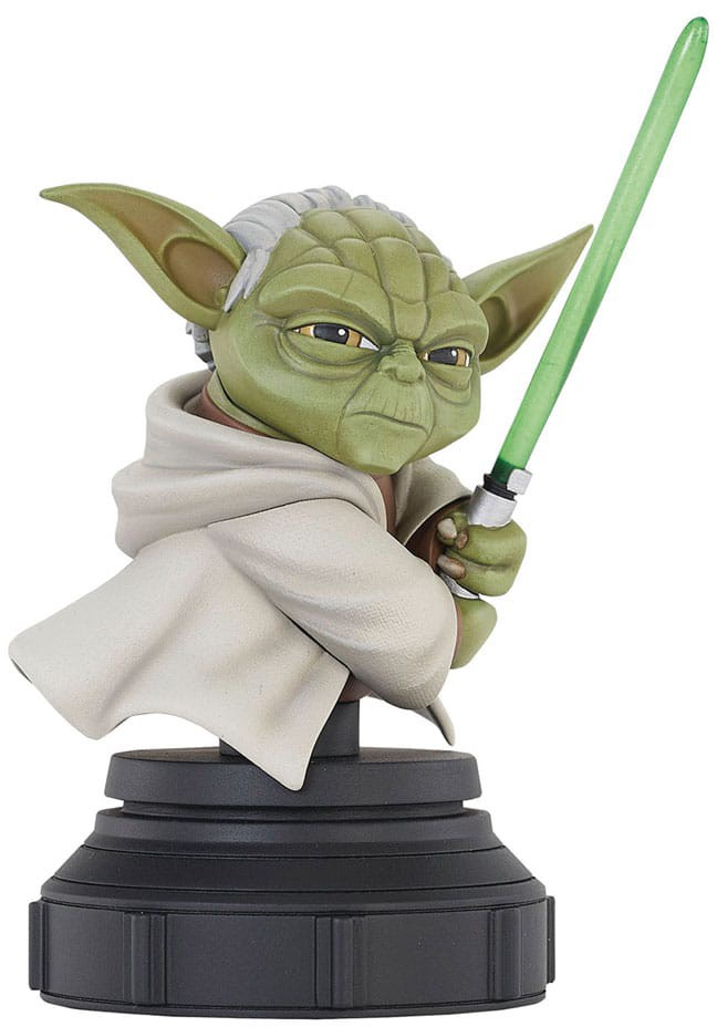 Begun the Clone Wars have! The line of Star Wars animated-style mini-busts continues with the reveal of Yoda! Measuring approximately 5 inches tall with his lightsaber raised, this detailed bust is based on his appearance in the Clone Wars animated series and sits atop a black pedestal. Limited to only 2,000 pieces, it comes packaged in a full-color window box with a numbered certificate of authenticity.
