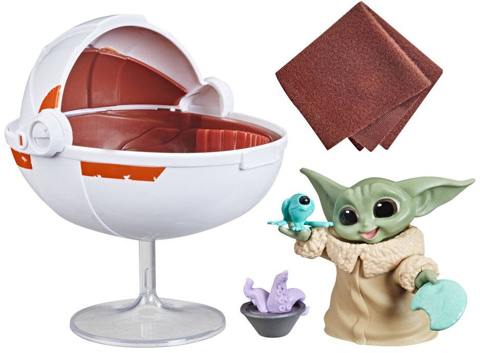 This posed cutie features The Child (Grogu) in a fun pose inspired by scenes from the live-action series on Disney+ and comes with 5 entertainment-inspired accessories, including hover-pram with float stand and removable pram cover, cookie, Sorgan frog, tentacle soup bowl, and fabric blanket!
